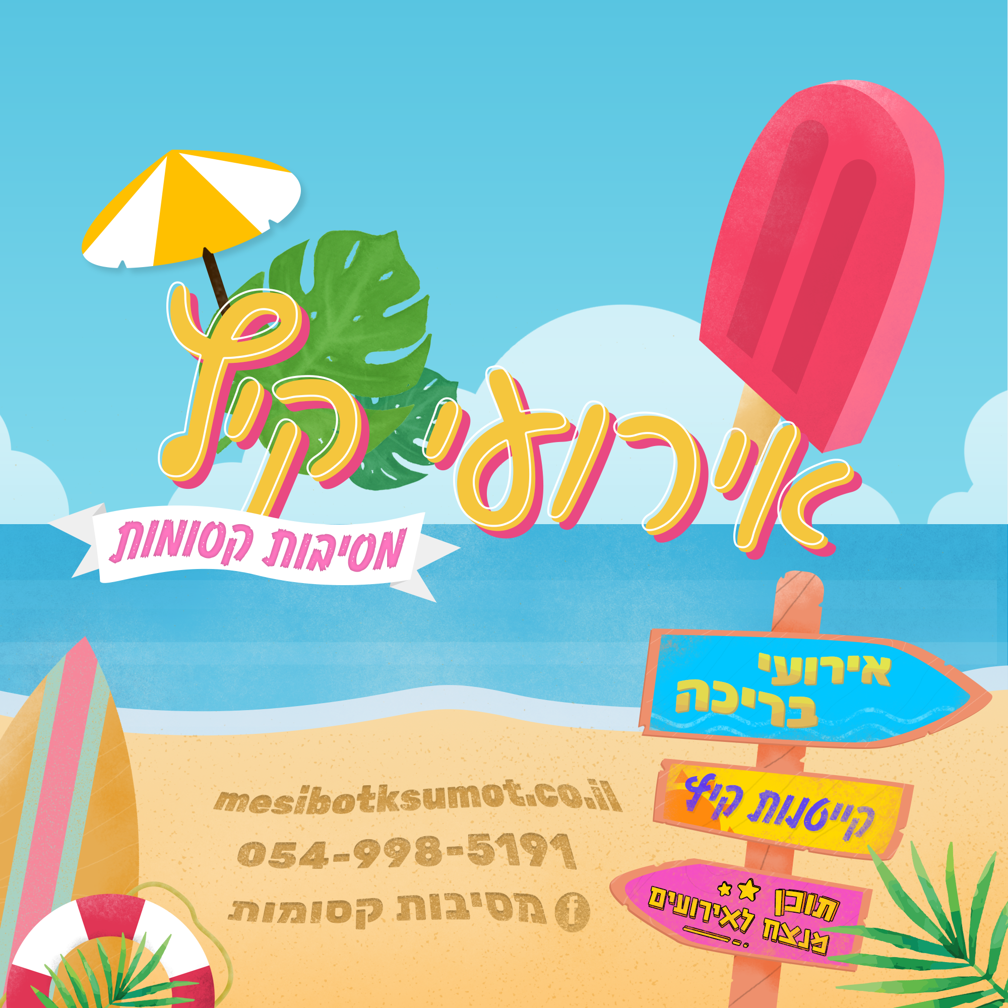 פוסט פרסום לחברת מסיבות קסומות שמשווק את אירועי הקיץ של החברה לילדים עם סגנון ציורי קיצי וכיפי